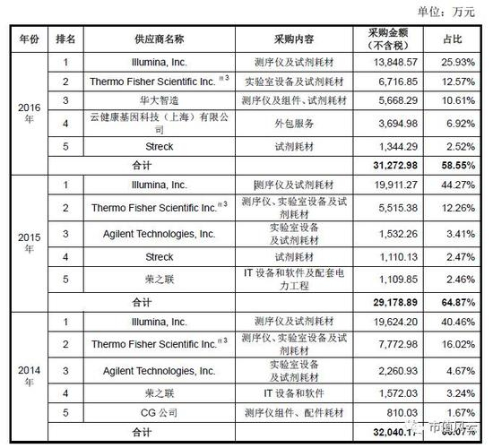 我们先来看看最近3年华大基因主要的供应商,关注测序仪以及试剂耗材就好。可以看到,Illumina、Thermo Fisher Scientific一直占据前两席,而想要与垄断龙头议价就好比水中捞月、大海捞针。