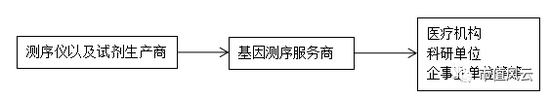 中间的基因测序服务商就是利用测序仪以及测序所需试剂、和基因样本做检测,之后将测序结果或是诊断类结果再传输给下游。