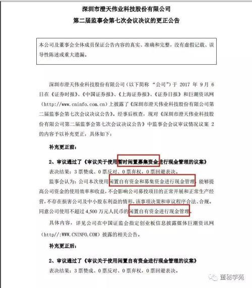 我们先来看看澄天伟业的三则更正公告:公告一:公司明明审议的是《审议关于使用闲置自有资金进行现金管理的议案》,但是议案标题却变为了《审议关于使用暂时闲置募集资金进行现金管理的议案》,自有资金和募集资金没有分清楚。