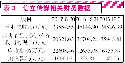实际上,除了2016年外,信立传媒2017年上半年也存在类似诡异的现象。经过计算,其2017年上半年也有将近6400万元的营业收入既没有以现金方式收回来,也没有形成应收账款,同样是莫名新增了。