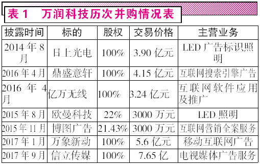 万润科技原本是一家专注于LED 光源器件和LED照明产品研发、设计、生产和销售的企业,自2012年在中小板市场上市发行股份后,在经历最初的2年安静期后,2014年开始,万润科技变得有点“躁动”,外延式并购动作持续不断,大踏步地向广告传媒领域转型。然而,从该公司近年来一系列并购动作看,在自身经营业绩稳步提升的同时,急剧攀升的商誉规模也为公司的未来经营发展带来不容忽视的风险,与此同时,并购标的信立传媒财务数据中所存在的诸多疑点也为公司此次并购埋下隐患。