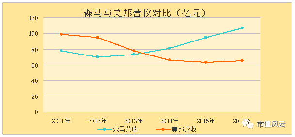 回顾2011年到2016年美邦服饰的经营业绩,风云君选取了与美邦同在浙江的森马服饰进行比较。