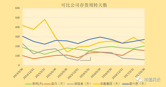 我们发现美邦服饰的周转天数在14年末和15年初有所下降后,从16年初又恢复了上升趋势,并且无论是存货周转天数还是应收账款周转天数都在新任管理层接手后创出了新高。我们也横向对比了几家可比公司的存货周转天数,如下图所示: