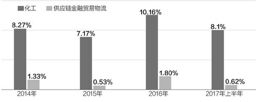 上交所的关注点在于,在营收成长之下,2017年上半年各板块毛利率都有所下调。对此,亿利洁能在回复问询函中表示,上半年毛利率水平下降的主要原因是附属于化工板块的供应链金融业务毛利率下降导致的。在化工板块常年毛利率至少超过10%的情况下,供应链金融业务的毛利率常年在1%左右徘徊,上半年仅为0.62%。而低毛利业务的营收占比的增长必然拉低总体毛利率。