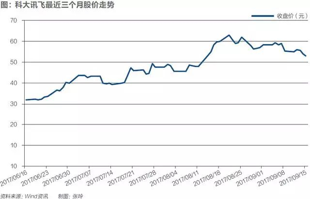 8月28日,科大讯飞股价冲高跳水,跌幅达6%。两日内市值蒸发近80亿元。几天之后,资本市场又掉头追涨,9月1日起,连续三日冲高。截至9月15日收盘,股价53.00元,市值约为736亿元。