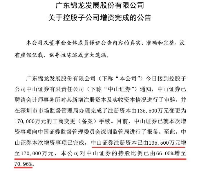 至此,锦龙股份对中山证券的持股比例已由66.05%增至70.96%。