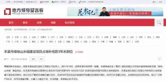 不仅如此,还曾有本溪市金昌石油化工有限公司负责人在人民网地方政府留言板爆料,称本溪绿地山水城项目拆迁补偿至今没有到位,导致金昌石化停工多年、陷入困境。