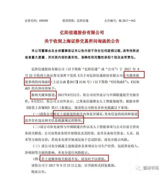这已经不是亿阳信通第一次澄清不及时了,2017年8月22日,上交所向亿阳信通发去问询函,因为有媒体报道,2017年8月21日,亿阳信通对外表示与中国联通展开全面合作,8月22日,媒体又报道,公司又对外表示“已筹备信通雄安人工智能基地。但是公司并没有公告,上交所要求公司对媒体报道进行说明,如果属实,公司信息披露是否违规,如果不属实,请公司尽快澄清。