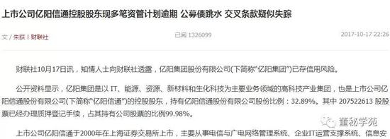 上交所所说的媒体报道则指的是近日关于亿阳信通控股股东亿阳集团存信用风险,兑付危机的报道。报道开始发酵是在10月17日,但是到目前为之,亿阳信通都没有发布任何澄清公告,并且在媒体进行电话采访和去到公司求证时,亿阳信通方面都是拒绝采访。