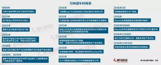 2010年,万向集团与美国Ener1公司合资,在杭州建立全自动化电芯及电池生产基地;2012年,万向集团以2.566亿美元价格收购了美国最大新能源电池制造商A123公司;2014年,收购美国菲斯科,并成立超豪华电动车Karma公司。