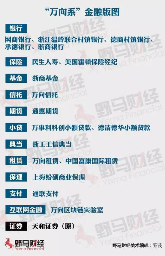 迄今为止,“万向系”至少掌握了万向钱潮、承德露露、万向德农、顺发恒业等4家上市公司控制权,并参股了华谊兄弟、广汽集团、新和成等18家A股、港股公司;布局有颂大教育、商安信等14家新三板挂牌公司;金融方面,则取得了除券商之外的几乎所有金融牌照。