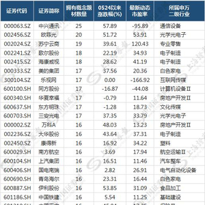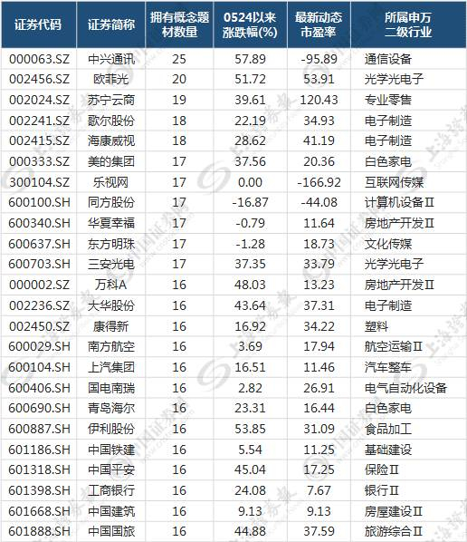 统计表明,5月24日以来,258只拥有10个及以上概念题材个股平均涨幅为19.85%,35只拥有15个及以上概念题材个股平均涨幅为22.34%,拥有25个和20个上概念题材的中兴通讯和欧菲光分别上涨了57.89%、51.72%(见下表)。
