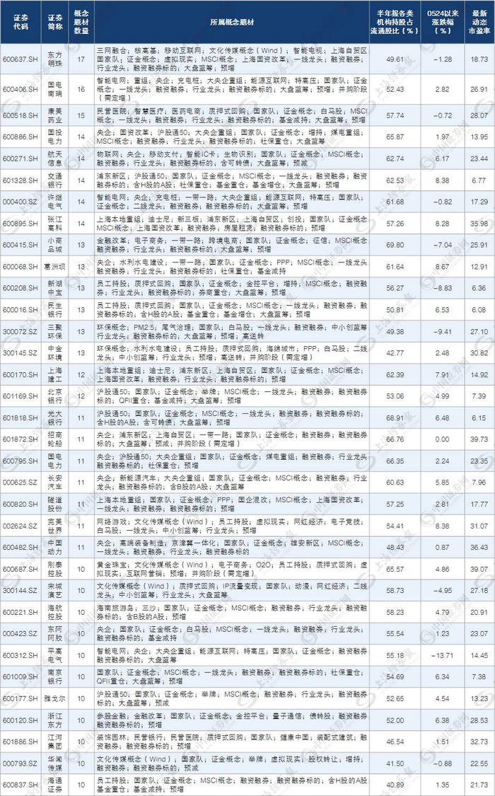 进一步观察258只拥有10个及以上概念题材个股, 5月24日以来涨幅不到10%、最新动态市盈率不到40倍、半年报各类机构持股占流通股比在40%-70%之间的个股有34只(见下表)。这些个股目前估值低企、之前涨幅有限、筹码集中度适中,在诸多概念题材催化下,后市出彩机会大。