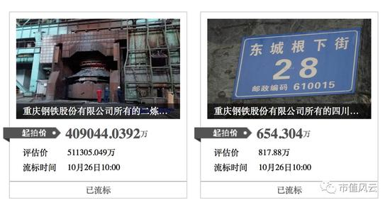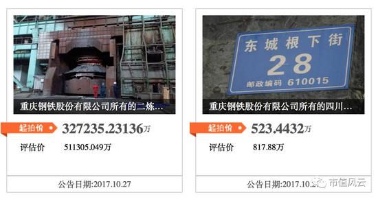 被拍卖资产分为2个标的:所有的二炼钢、棒线、型钢等资产,估值51.13亿元,起拍价32.72亿元;四川省成都市青羊区东城根下街28号15F、青羊区金丝街22号6楼1号的房产,估值817.88万元,起拍价523.44万元。