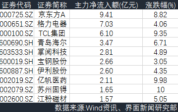 京东方A(000725.SZ)重获主力资金热捧,全天净流入9.41亿元,股价亦大涨8.82%。家电板块走强,格力电器(000651.SZ)、TCL集团(000100.SZ)、青岛海尔(600690.SH)分别实现主力净流入7.03亿元、6.10亿元、3.47亿元。此外,食品饮料、医药板块均获主力资金青睐。标的个股伊利股份(600887.SH)、亿帆医药(002019.SZ)分别净流入2.60亿元、2.11亿元。钢铁板块反弹走高,宝钢股份(600019.SH)净流入2.66亿元。