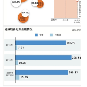 这是通威股份今年以来对外公布的第五份投资公告。从今年1月到11月,通威股份已宣布在四川、内蒙古投建多个光伏能源项目,累计投资额高达330亿元,按照其预测,项目完全投产后将新增营业收入在415亿元以上,相当于2016年营收209亿元的两倍。