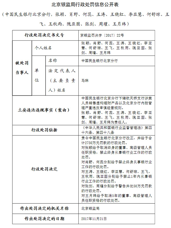 11月30日,北京银监局公布的行政处罚信息公开表(京银监罚决字〔2017〕22号)显示,中国民生银行北京分行下辖航天桥支行涉案人员销售虚构理财产品以及北京分行内控管理严重违反审慎经营规则。责令中国民生银行北京分行改正,并给予合计2750万元罚款的行政处罚。