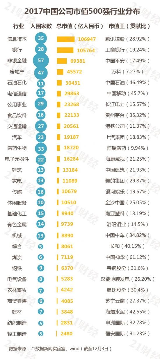 从千亿市值巨头的行业分布情况已见端倪,范围进一步扩大到500强,21数据新闻实验室发现,非银金融(57家)、房地产(47家)、信息技术(35家)、医药生物(33家)四大行业入围公司最多,均超过30家。
