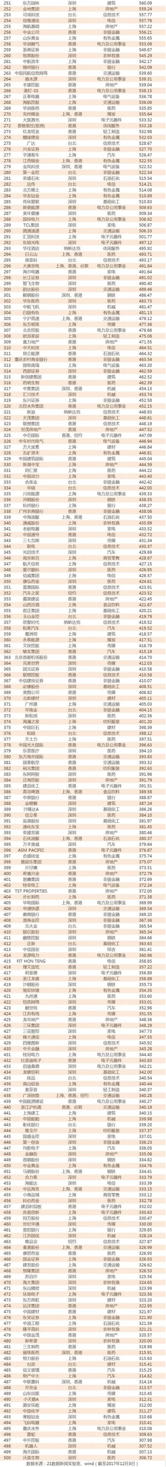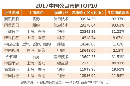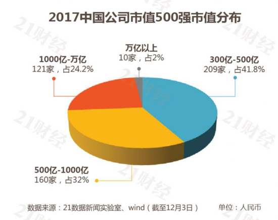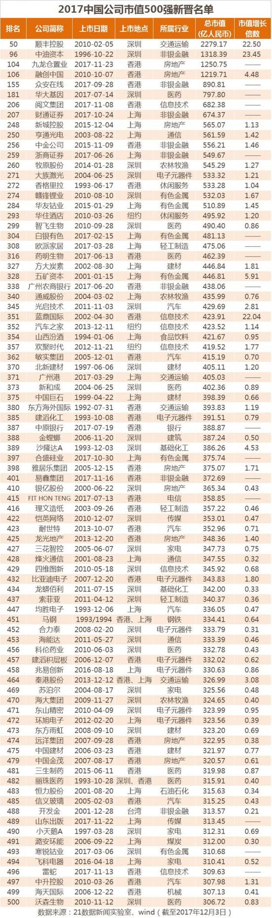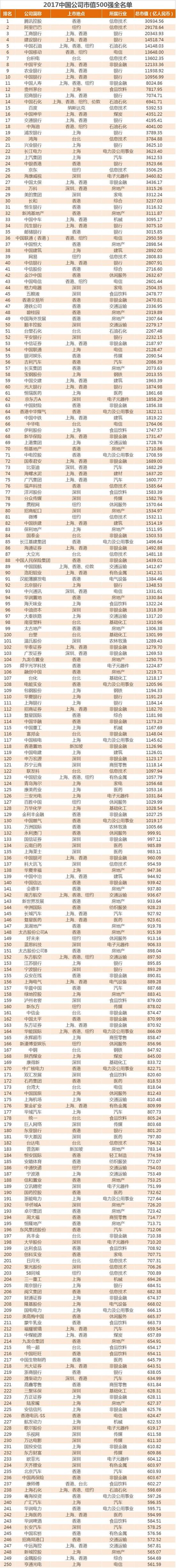 2017中国上市公司市值500强:上榜门槛300亿(名单)