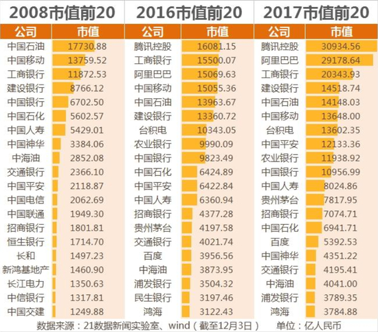 值得一提的是,这也是十年来首次,互联网科技公司包揽前两名。而在2008年至2014年,中国石油一直雄踞市值榜首,占据第二名的基本是工商银行;2015年则由工商银行、中国移动领先。