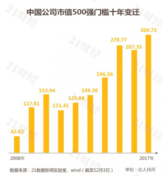 而进入500强的市值门槛,从2008年12月的42.62亿到最新的306.72亿,剧增了6倍之多,明显跑赢中国上市公司的增长速度。