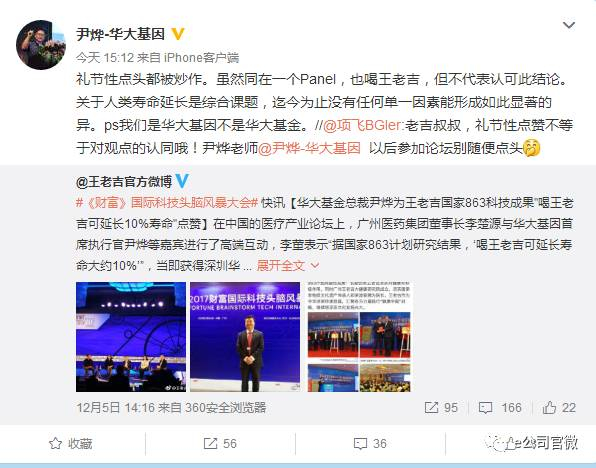 就在今天下午,华大基因CEO尹烨在微博上否认了对“喝王老吉可延长寿命”这一观点的认同。