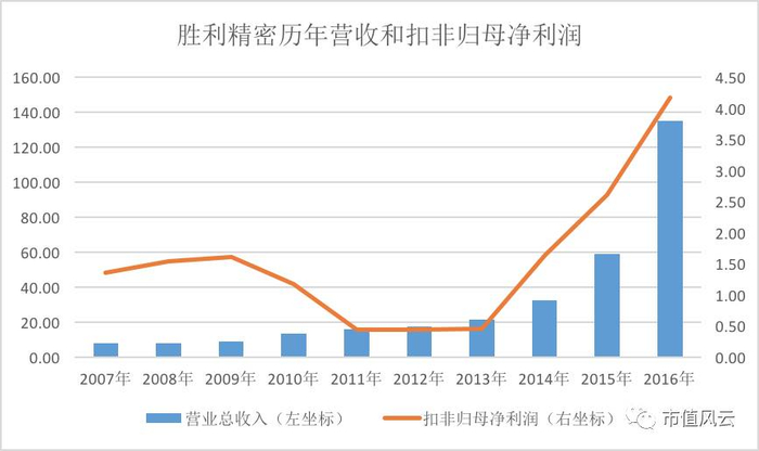 上市当年业绩就duang下来了,之后的2011、2012、2013年情绪比较稳定,小幅稳步增长。一切都得从2014年说起,胜利精密像吃了蓝色小药丸,业绩一下就坚挺起来,大有一发不可收拾的势头。