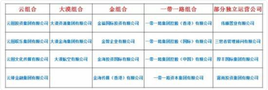 从业务方面来看,这些公司没有实际联系,只是名字联系比较紧密,可划分为 “ 云组合 ”、“ 大漠组合 ”、“ 金组合 ”、“ 一带一路 ” 以及部分独立运营公司。