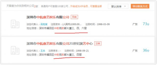而其投资的一个名为深圳市中航康艺娱乐有限公司 21 世纪演艺中心的公司(目前处于注销状态),注册地址也是深圳市福田区中航苑航都大厦三、四层。经营范围是卡拉 OK 和歌舞表演。