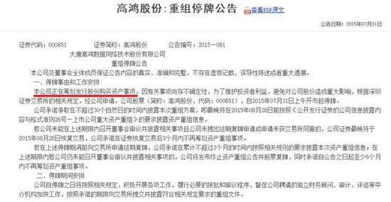 (2015年7月31日高鸿股份发布的停牌公告)