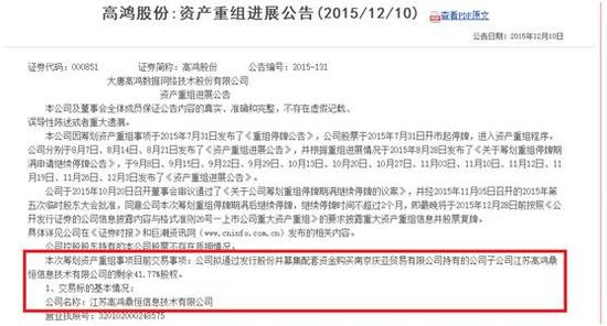 (2015年12月10日,高鸿股份发布的资产重组进展公告)
