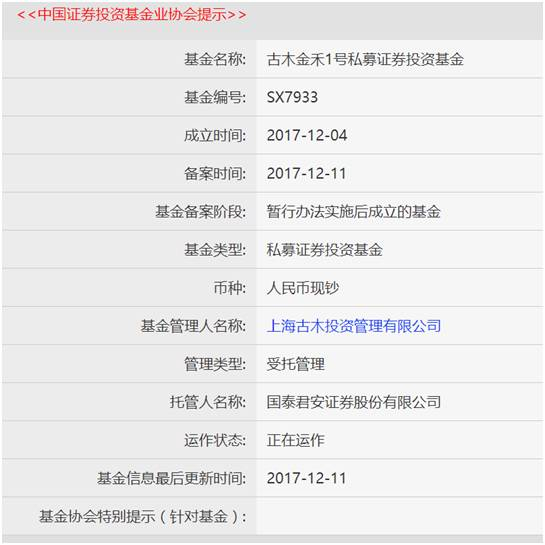 2、1600万认购上海古木投资管理有限公司旗下的“古木金禾1号私募证券投资基金”,该基金也已在中国基金业协会完成备案,显示为一只私募证券投基金。上海古木投资管理有限公司则是一家成立于2011年的私募证券投资基金管理人,注册资本金1000万。