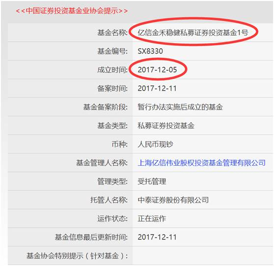 一是出资2000万认购上海亿信伟业股权投资投资基金管理有限公司旗下产品,“亿信金禾稳健私募证券投资基金1号”。目前该产品已经完成备案,基金管理人上海亿信伟业股权投资基金成立于2010年10月18日,注册资本金1000万,法定代表人为郝丹,公司有12只产品在协会备案。