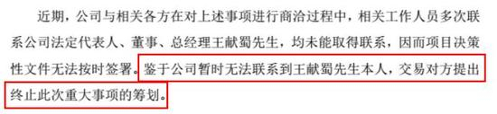 王献蜀为什么会失联呢?野马财经致电上市公司董秘办,对方称,公司也正在调查,后续进展会在公司管理层商议后对外公告,暂时不会重启收购计划。