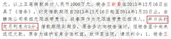 南昌市中级人民法院民事判决书显示,2013年王献蜀因其巴士公司资金周转困难,向原告邹伟鹏借款,五笔转款共计人民币1000万元,并口头约定月利息为5分(60%的年利率)。借款期限到期后,邹伟鹏多次向王献蜀催讨,但被告至今尚未返还欠款。2016年2月,邹伟鹏只有向王献蜀与中麦控股发起了起诉。