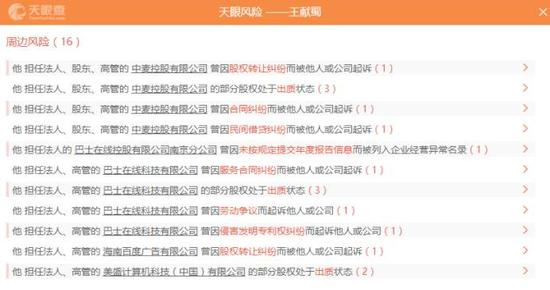 比起股权转让和关联关系,王献蜀被卷入的麻烦可能比想象中还要多,光天眼查提示的风险就有16起之多。而多起股权转让纠纷和民间借贷官司或许也令他焦头烂额。