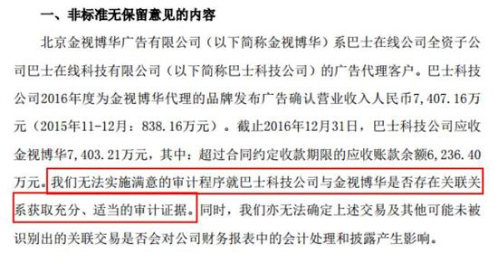 该《说明》称,“我们无法实施满意的审计程序就巴士科技与金视博华是否存在关联关系获取充分、适当的审计证据。同时,我们亦无法确定上述交易及其他可能未被识别出的关联交易是否会对公司财务报表中的会计处理和披露产生影响。”