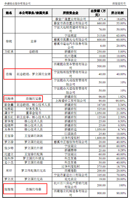 而上述揽众天道和揽众资产的监事罗燚是罗立国的女儿,为合盛硅业副董事长、董事,浩瀚为罗立国女婿,在合盛硅业担任副总经理,张微微是浩瀚的母亲。