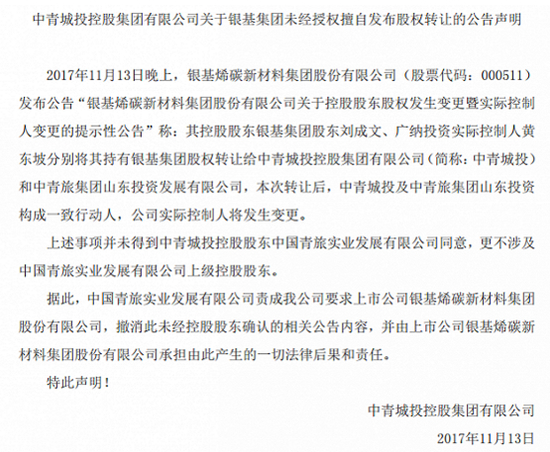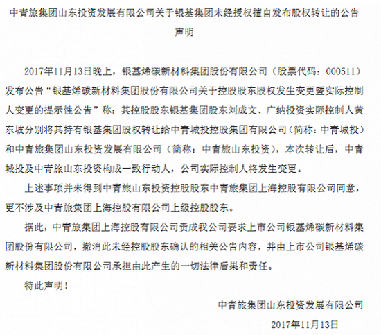 与此同时,*ST烯碳也收到了中青旅山东投资一份内容类似的函件《中青旅集团山东投资发展有限公司关于银基集团未经授权擅自发布股权转让的公告声明》。