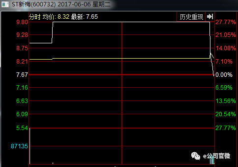 又如ST新梅(600732),也为投资者好好上了一课。今年6月恢复上市,盲目买入的投资者,当天就有可能亏损30%以上!开盘之初,ST新梅就像新股一样“涨停”,涨幅达到28%,然而到了尾盘最后5分钟被狠狠砸下来,最终还跌了0.26%。
