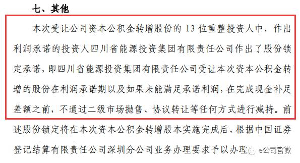 有上述方案可以看出,重整投资人受让转增股份的成本很低,为4.3元/股,远低于暂停上市前一交易日收盘价的10.27元/股。与此同时,除了大股东四川能投外,其他12名重整投资人所获股份并没有限售要求。