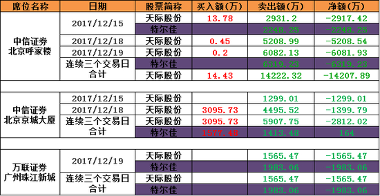第二个出现的则是中信证券股份有限公司北京京城大厦证券营业部。12月15日,该席位净卖出天际股份1299.01万元;12月18日,买入天际股份3095.73万元,卖出4495.52万元,净卖出1399.79万元。近三个交易日,合计买入天际股份3095.73万元,卖出5907.75万元,净卖出2812.02万元。同时,这三个交易日合计买入特尔佳1577.48万元,卖出1413.48万元,合计净买入164万元。