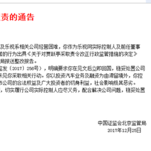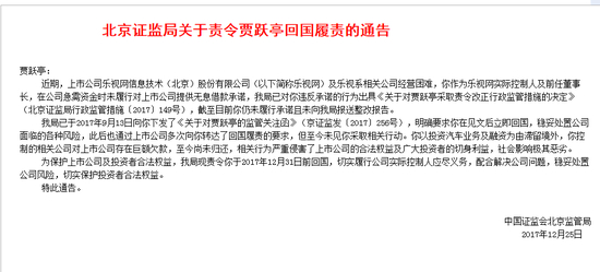 新浪财经讯 12月25日消息 北京证监局25日发布通告,责令乐视网前任董事长贾跃亭于2017年12月31日前回国,切实履行公司实际控制人应尽义务,配合解决公司问题,稳妥处理公司风险,切实保护投资者合法权益。
