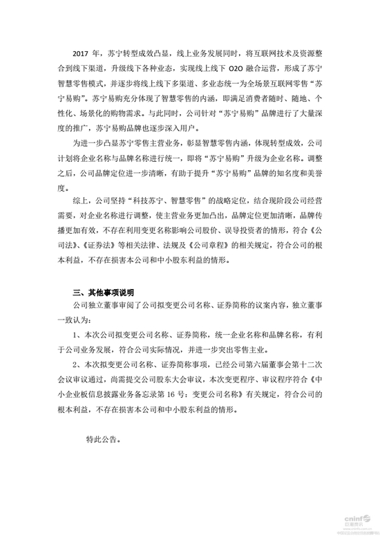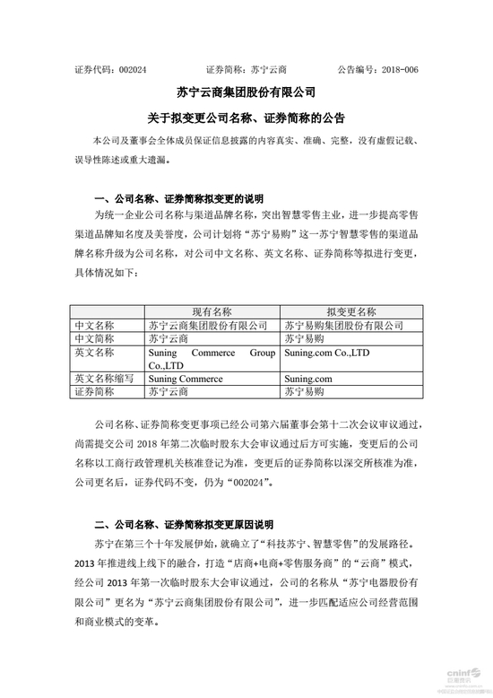 新浪财经讯 1月14日消息,苏宁云商今日晚间公告称,为统一企业公司名称与渠道品牌名称,突出智慧零售主业,进一步提高零售渠道品牌知名度及美誉度,公司计划将“苏宁易购”这一苏宁智慧零售的渠道品牌名称升级为公司名称。证券简称将变更为“苏宁易购”,证券代码不变。