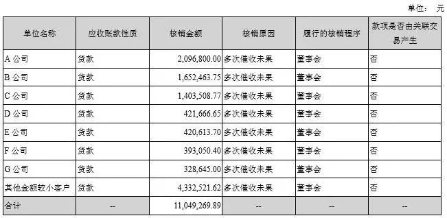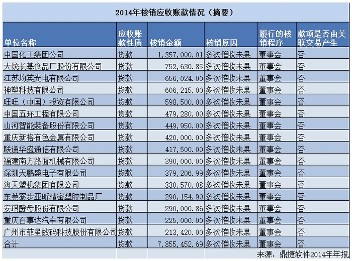 鼎捷软件2014年年报披露了部分核销坏账名单,披露部分合计核销金额约为785.55万元,相当于当期全部核销金额的70.91%(当期为1107.79万元)。另外,该年报名单显示,核销的坏账均为应收的货款,之所以核销都是因为多次催收未果。这意味着,名单中的公司均是欠钱不还的“老赖”。