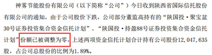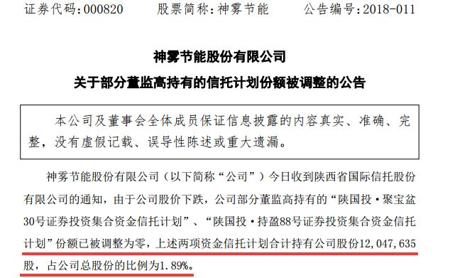 公告中提到,神雾节能接到陕西省国际信托股份有限公司的通知,“陕国投·聚宝盆30号证券投资集合资金信托计划”、“陕国投·持盈88号证券投资集合资金信托计划”信托财产净值已低于止损值,并未按时足额追加增强信托资金,根据信托计划管理合同的相关约定,自2018年1月18日起,参与上述两项资金信托计划的公司董监高持有的上述两项资金信托计划信托份额调整为零,参与上述两项资金信托计划的公司董监高不再享有上述信托项下任何权益。