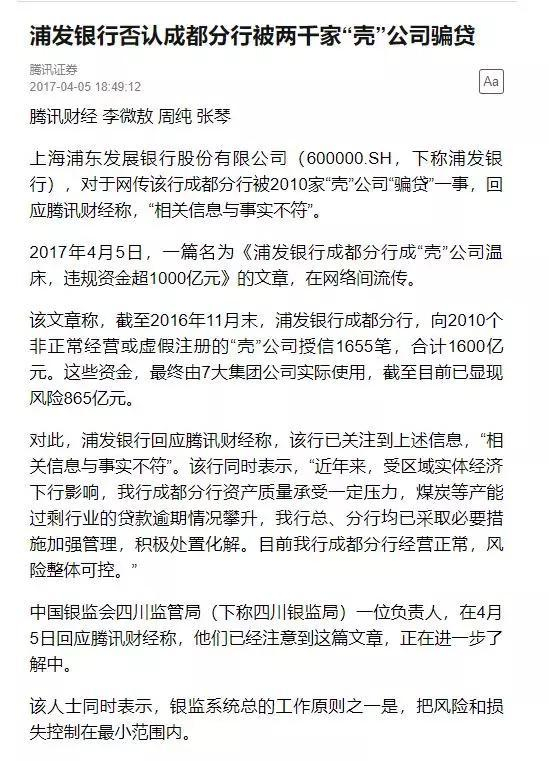 2017年4月5日,一篇名为《浦发银行成都分行成“壳”公司温床,违规资金超1000亿元》的文章,在网络间流传。