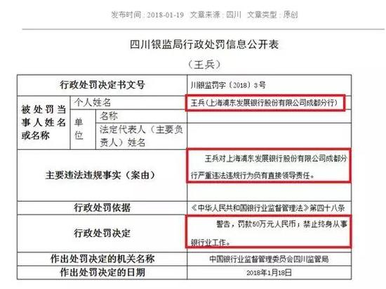 据了解,王兵曾任浦发银行成都分行行长,四川银监局的处罚理由为:王兵对浦发银行成都分行严重违法违规行为负有直接领导责任。具体处罚内容包括两条,1是警告,罚款50万元人民币;2是禁止终身从事银行业工作。