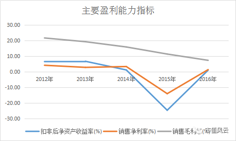 综合毛利率一路下滑,从2012年的21.71%下跌到2016年的7.41%。其扣非后净资产收益率和销售净利率同样惨不忍睹,最近五年销售净利率从来没有超过5%,2016年是1.45%,同年扣非后净资产收益率1.1%,都远不如理财产品的年化收益率。
