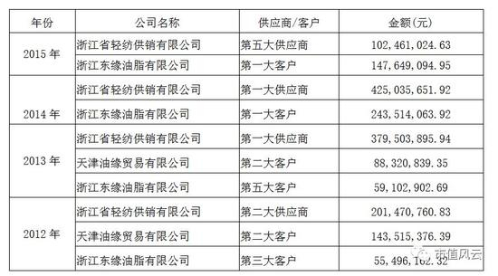 在上面三家公司中,浙江东缘油脂和天津油缘都是浙江轻纺供销公司的全资子公司(天津油缘于2015年被浙江轻纺供销强制破产清算,目前股东已非轻纺供销公司),浙江东缘和天津油缘都长期是莱茵体育的前五大客户之一。